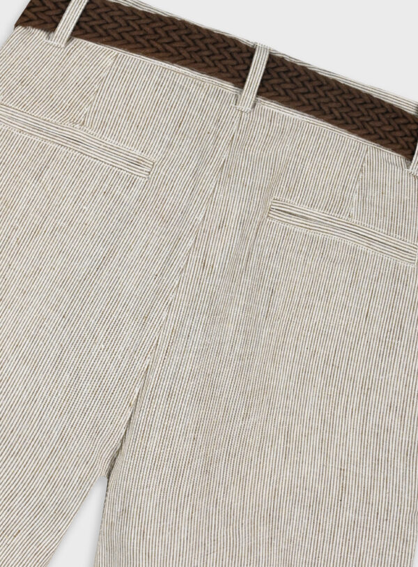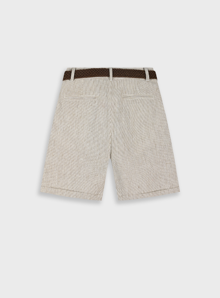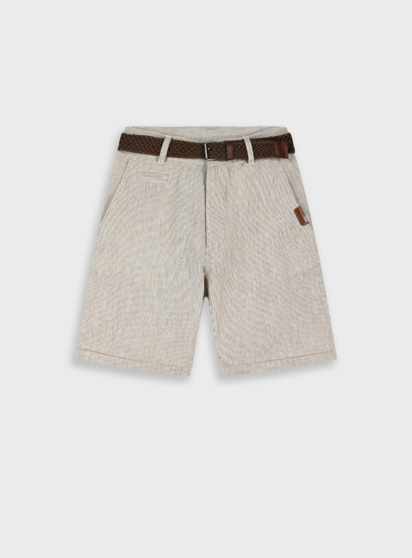 Βερμόυδα σε ριγέ σε σοκολατί- μπεζ χρώμα με καφέ ζώνη, μη ξεχάσεις αν τη συνδυάσεις με ασορτί γιλέκο η κάποιο πουκάμισο για ένα ολοκληρωμένο σύνολο.