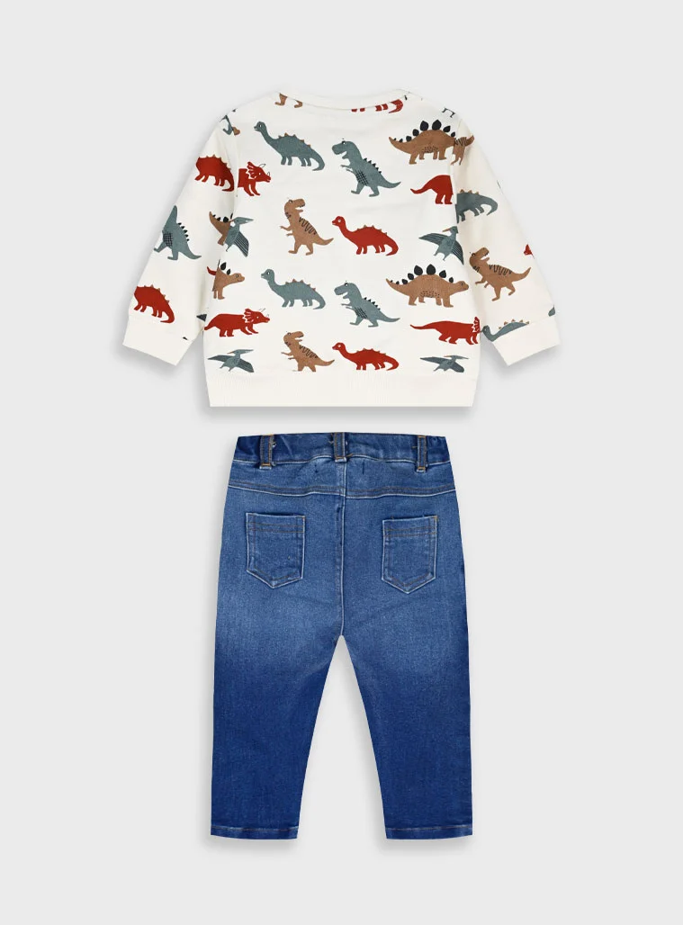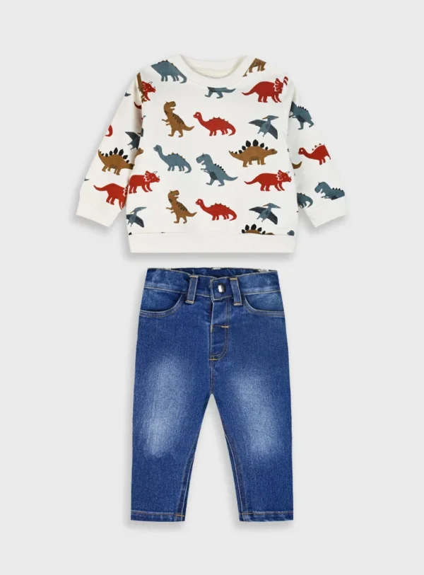 Βρεφικό σετ 2 τεμαχίων,τζην παντελόνι με μαλακό εσωτερικό λάστιχο στη μέση και μπλούζα με τύπωμα χρωματιστά δεινοσαυράκια για αγόρι,ιδανική επιλογή για μια απογευματινή γεμάτη παιχνίδι βόλτα