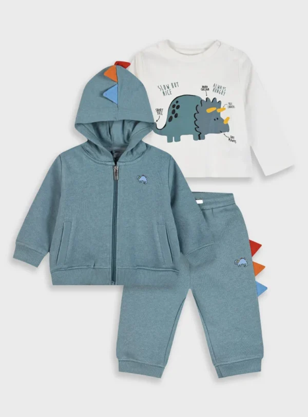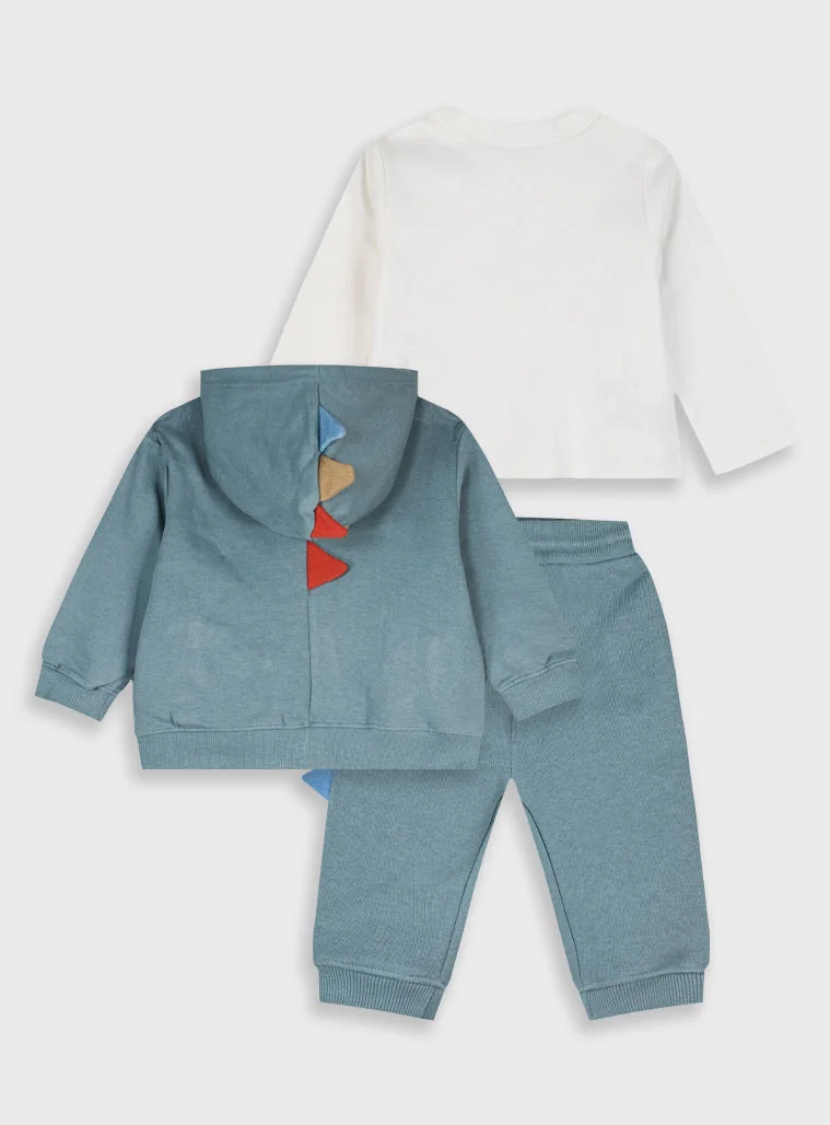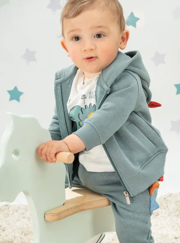 Βρεφικό σετ 3 τεμαχίων για αγόρι, ζακέτα με κουκούλα και σχέδιο όπως και στο παντελόνι που είναι στο ίδιο χρώμα ενώ η μπλούζα λευκή με τύπωμα ρινόκερο στο μπροστά μέρος.