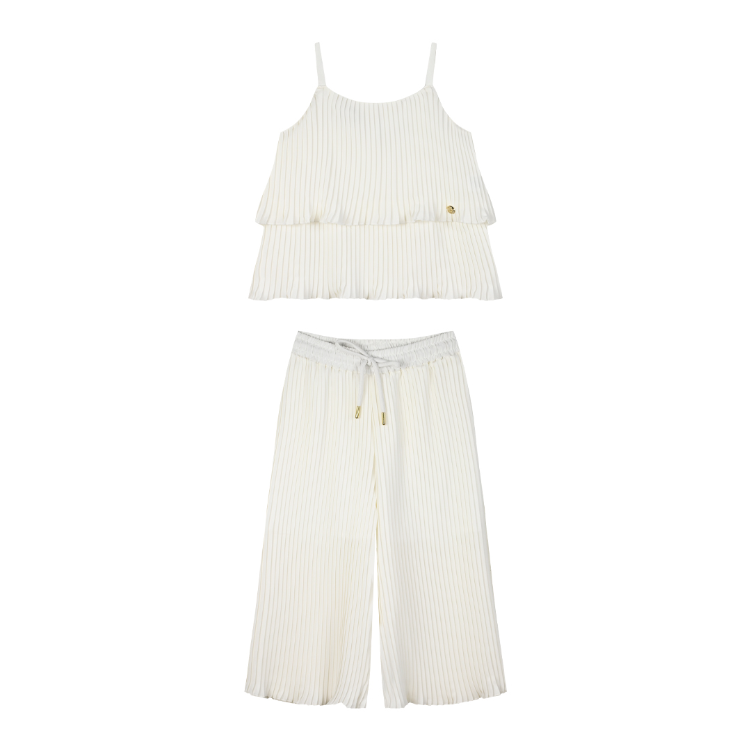 Λευκο σετάκι πλισέ με παντελόνα και τοπ με τιράντες , ιδανικό για μια καλή περίσταση , ετσι ώστε να έιναι το κορίτσι σας άνετό και στιλάτο.