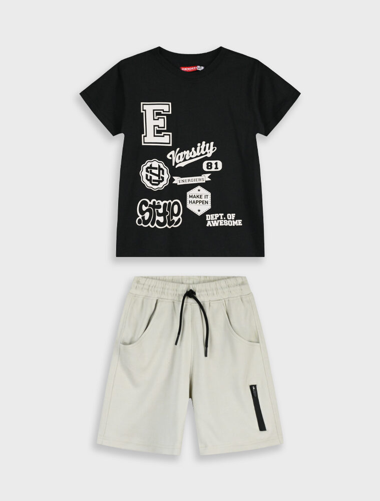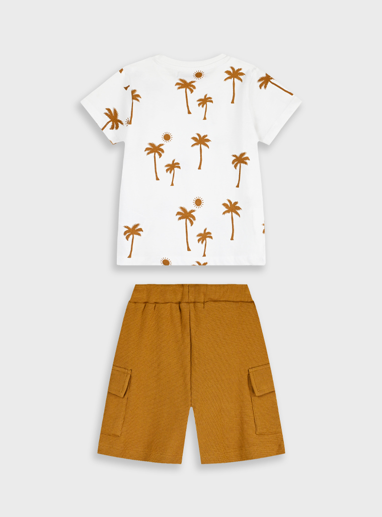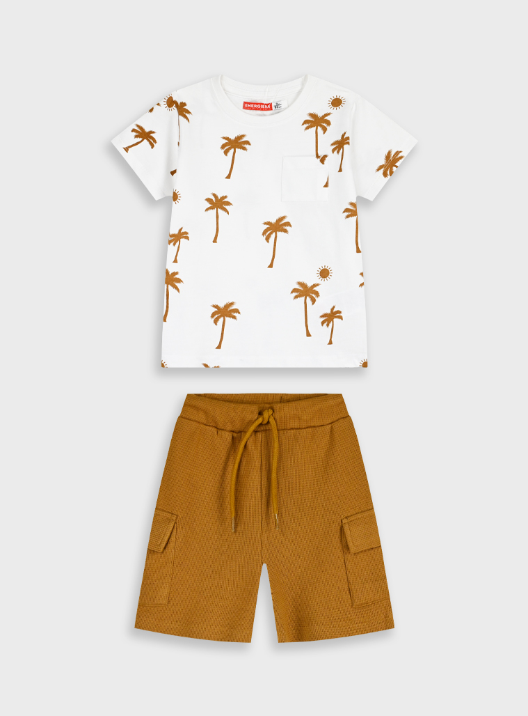 Καλοκαιρινό Σετ με βερμούδα για αγόρι εμπριμέ ,λευκή μπλούζα και σοκολατι παντελόνι