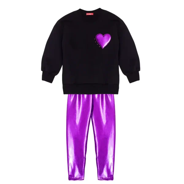 Σετ με φούτερ μπλούζα, λαιμόκοψη, χωρίς χνούδι μέσα, με τύπωμα μεταλιζέ καρδιά μπροστά.Ασορτί μεταλιζέ κολάν σε έντονο χρώμα, στο μαλακό και ανθεκτικό κολάν αυτού του τύπου!