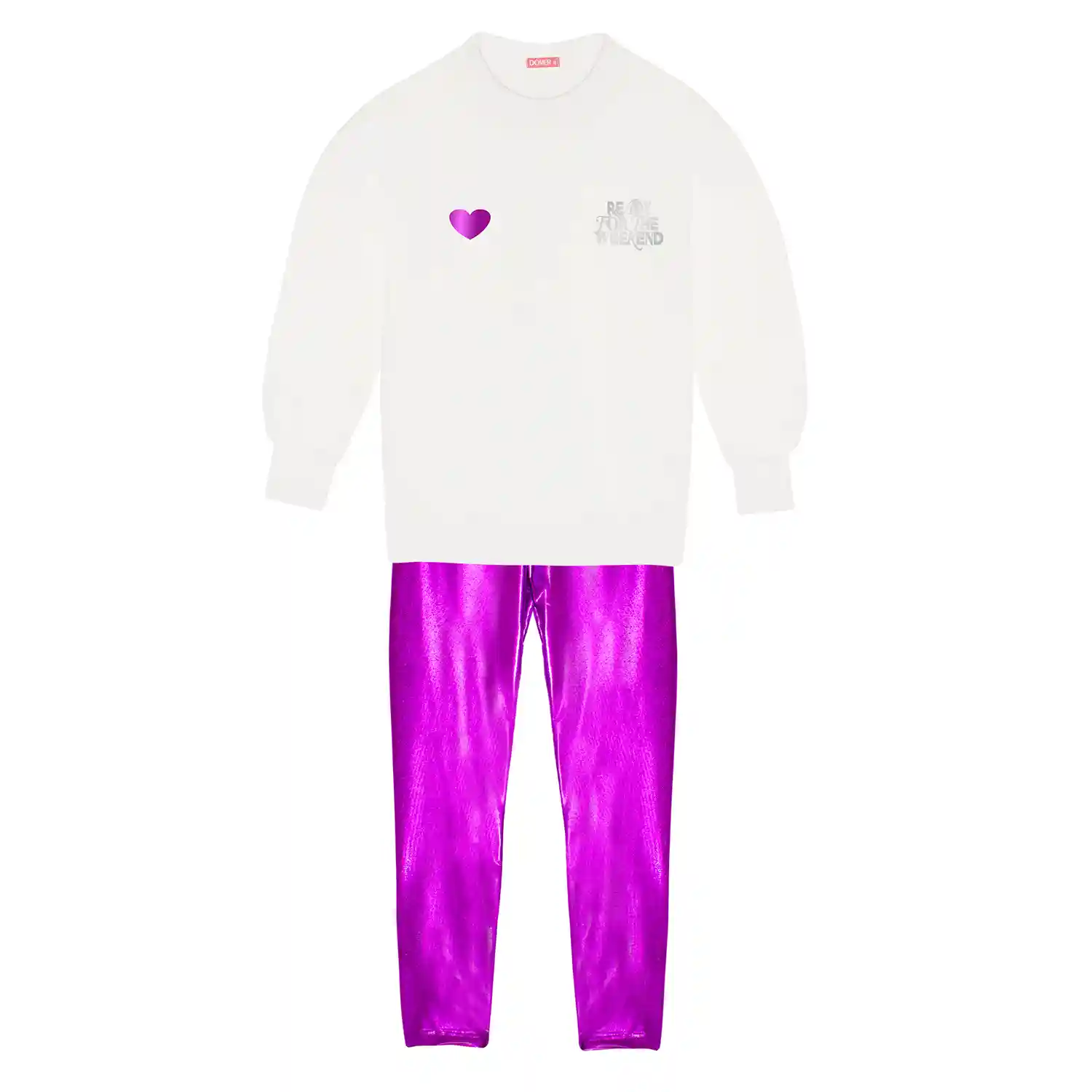 Εντυπωσιακό παιδικό σετάκι με μεταλλιζέ μώβ απόχρωση στο κολάν με ελαστική εφαρμογή, συνδιασμένο με λευκό αχνούδωτο στυλ φουεράκι .Ιδανικό για μοντέρνες εμφανίσεις!