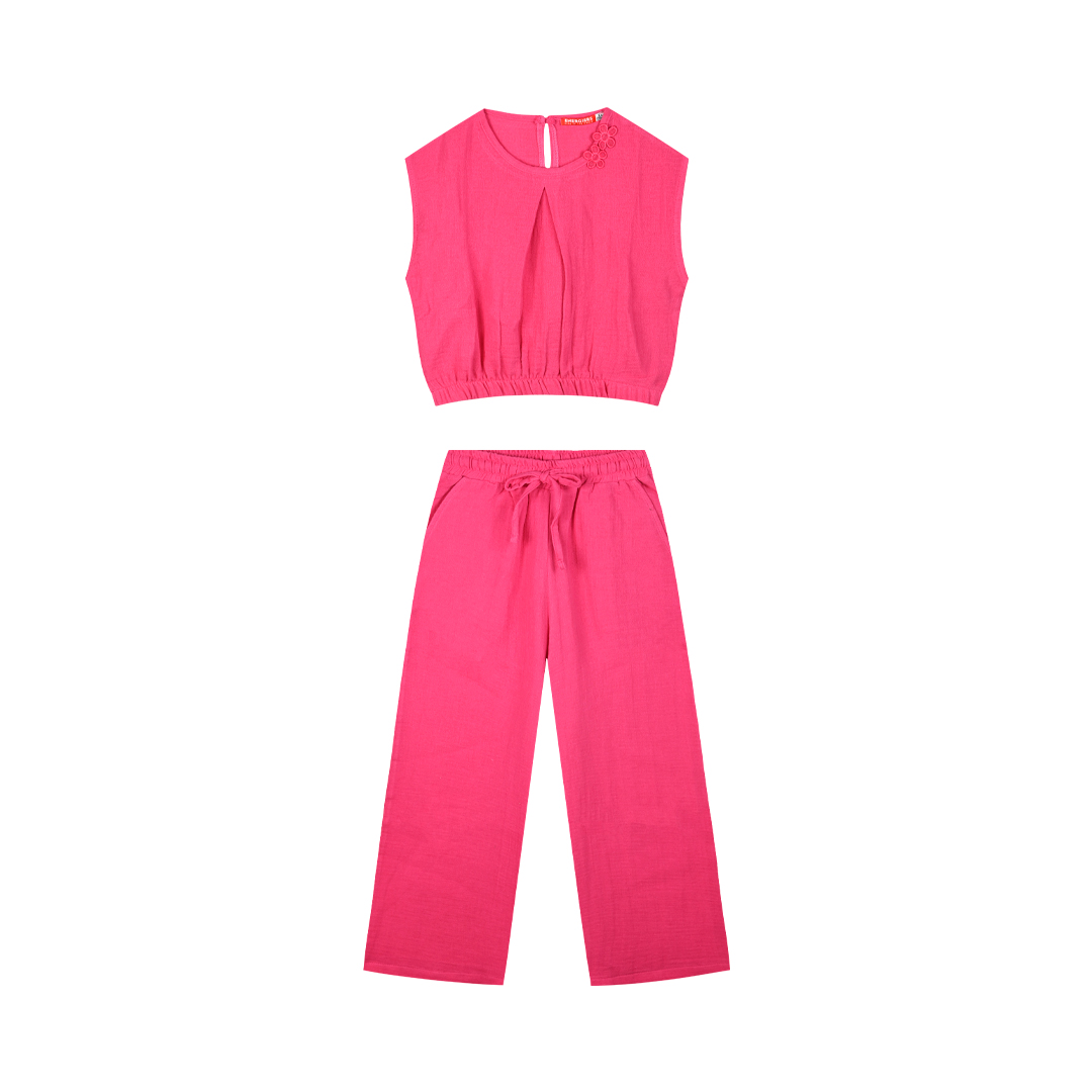 Σετ λινό για κορίτσι με υπέροχο χρώμα που συνδυάζει παντελόνα σε ίσια γραμμή με κροπ τόπ μπλουζάκι με λάστιχο. για να είναι άνετη αλλα και στιλάτη.