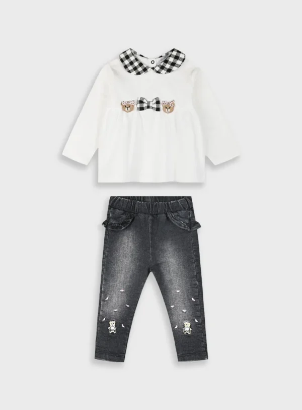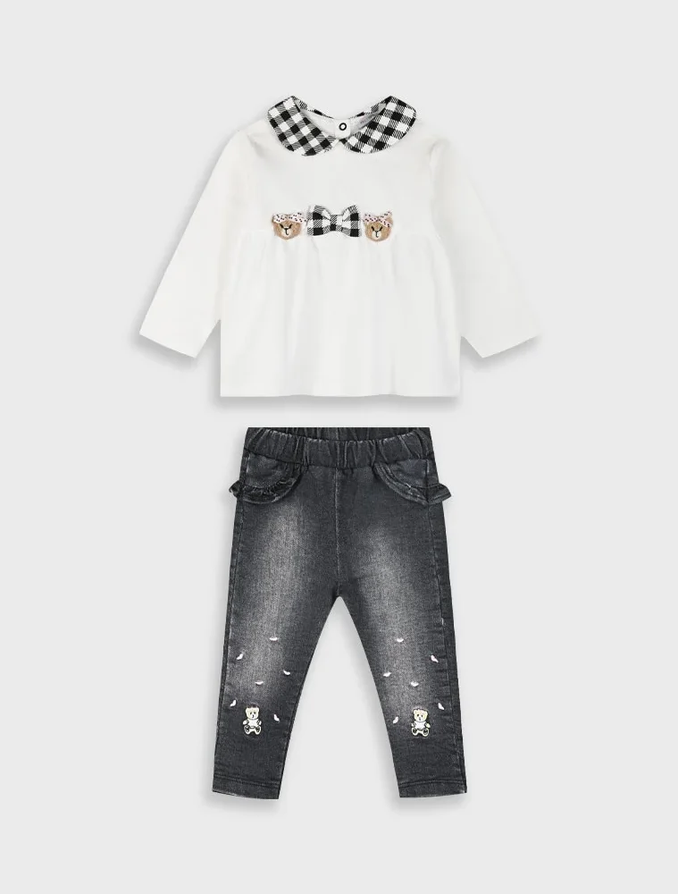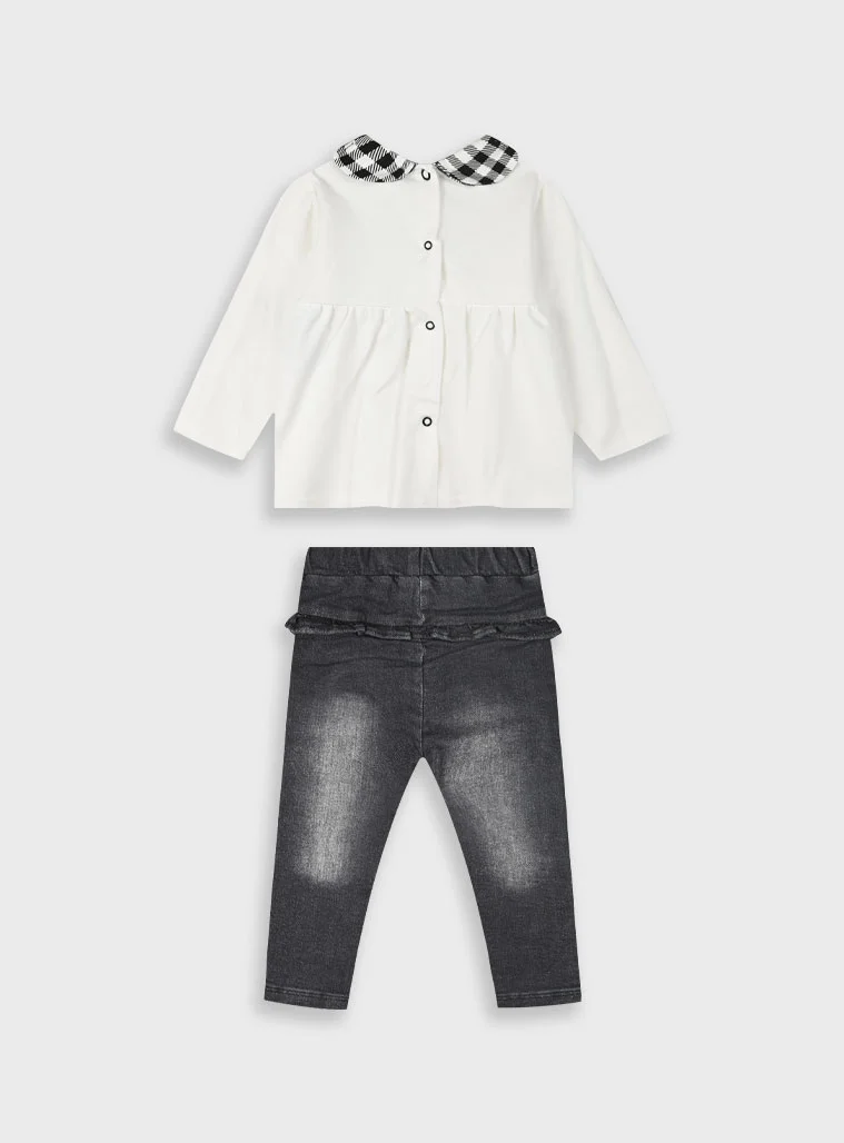 Βρεφικό σετ κορίτσι που αποτελεί μαυρό μαλακό τζίν με σχέδια στο κάτω μέρος συνδυασμένο με λευκή μπλουζίτσα με σχέδιο μπροστά με γιακά και κουμπία στο πίσω μέρος