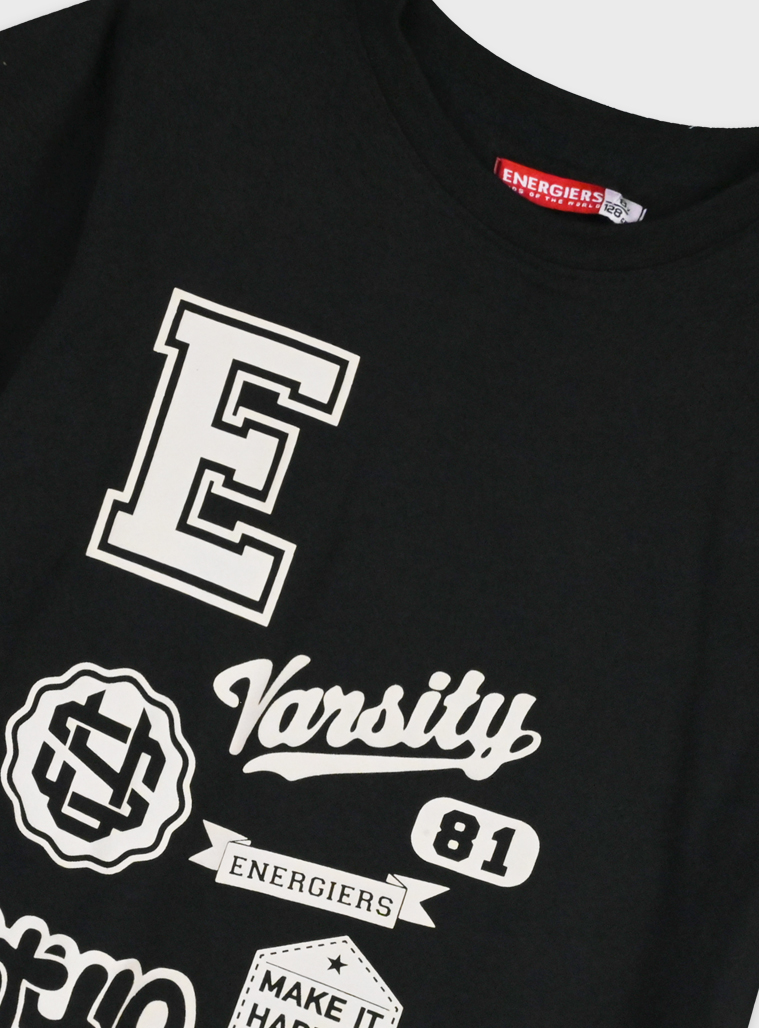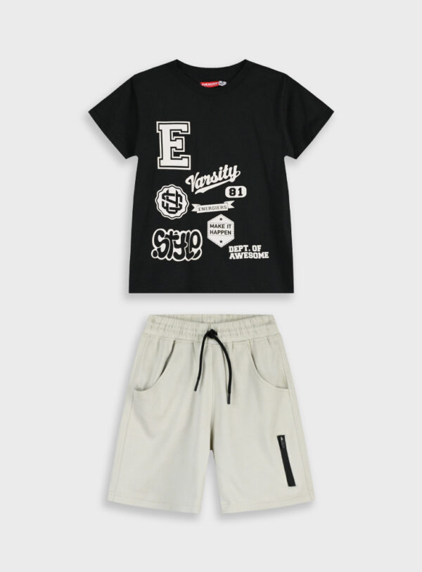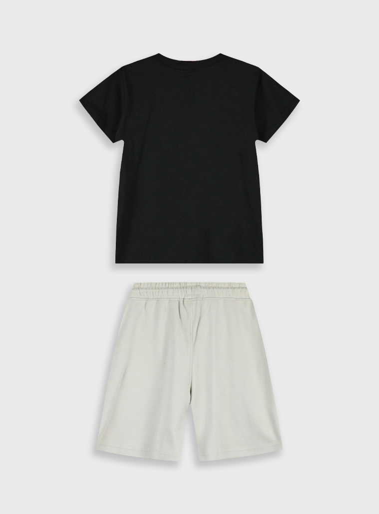 Καλοκαίρινο σετάκι για αγόρι με μπέζ βερμούδα και μαύρη μπλούζα με τύπωμα.