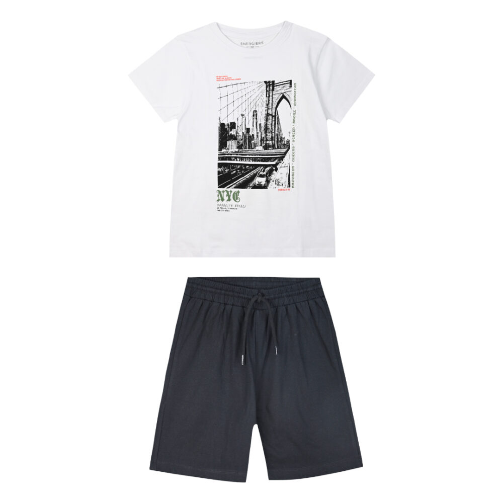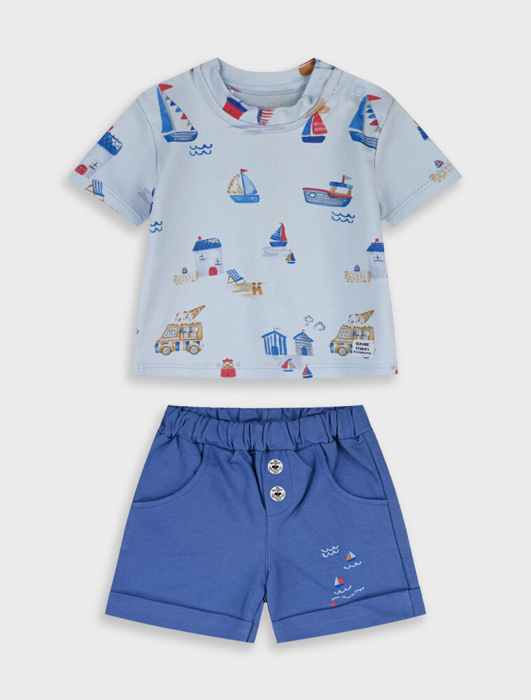 Βρεφικό Σετ με σορτσάκι και κοντομάνικη μπλούζα σε μπλέ αποχρώσεις.