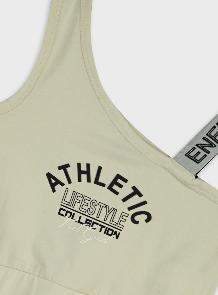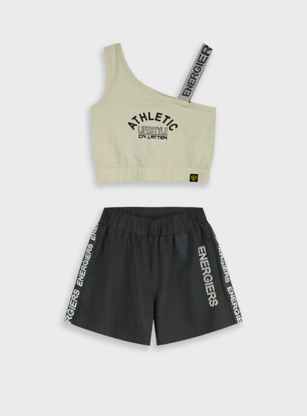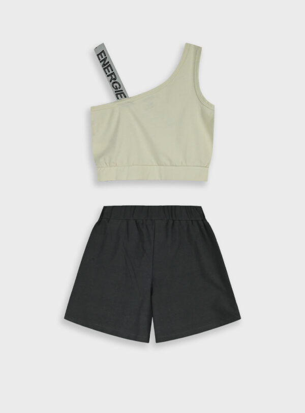 Καλοκαιρινό σετ με μαύρο σορτσάκι με σχέδιο γράμματα συνδυασμένο με μπεζ κροπ τοπ με τύπωμα.