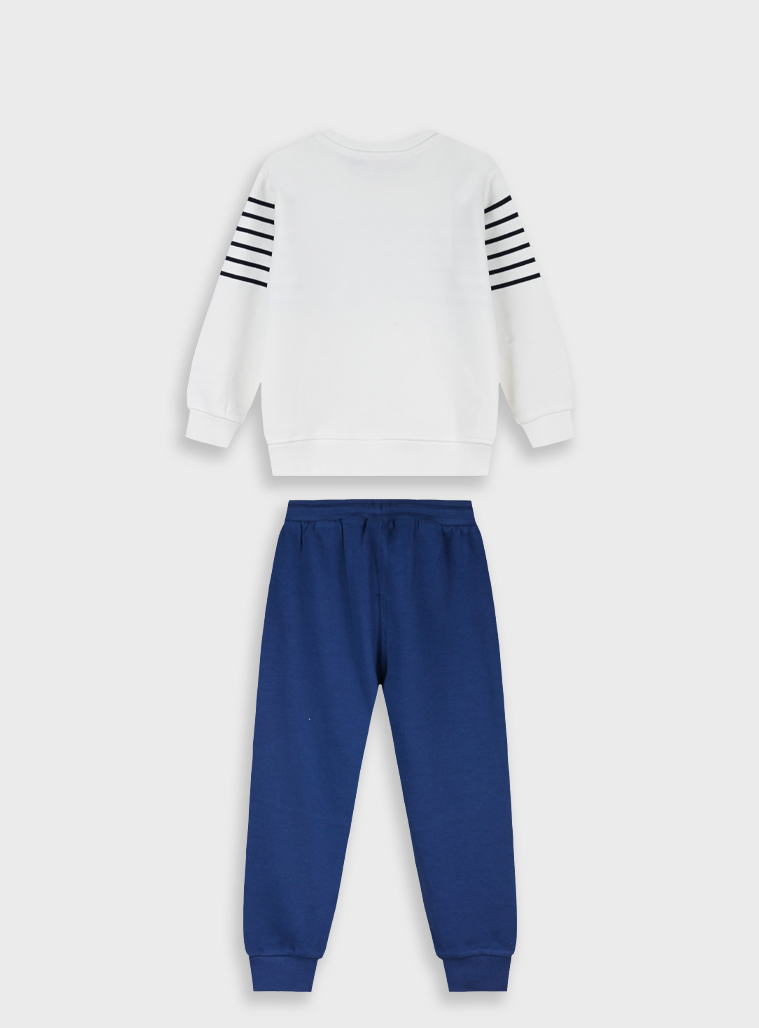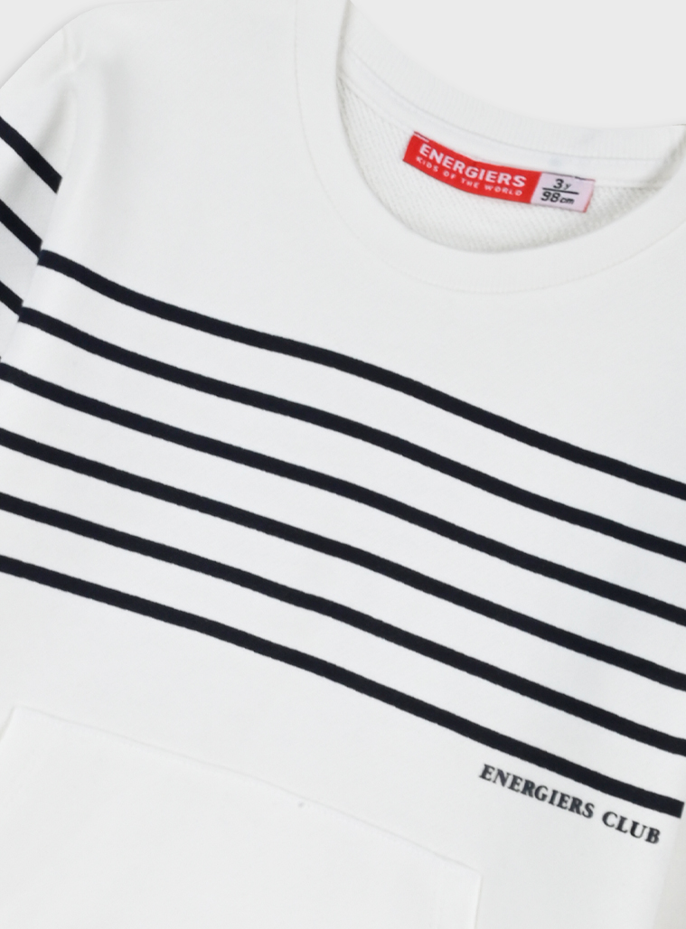 Αχνούδωτο σετάκι με λευκή ριγέ μπλούζα και μαρέν παντελόνι.