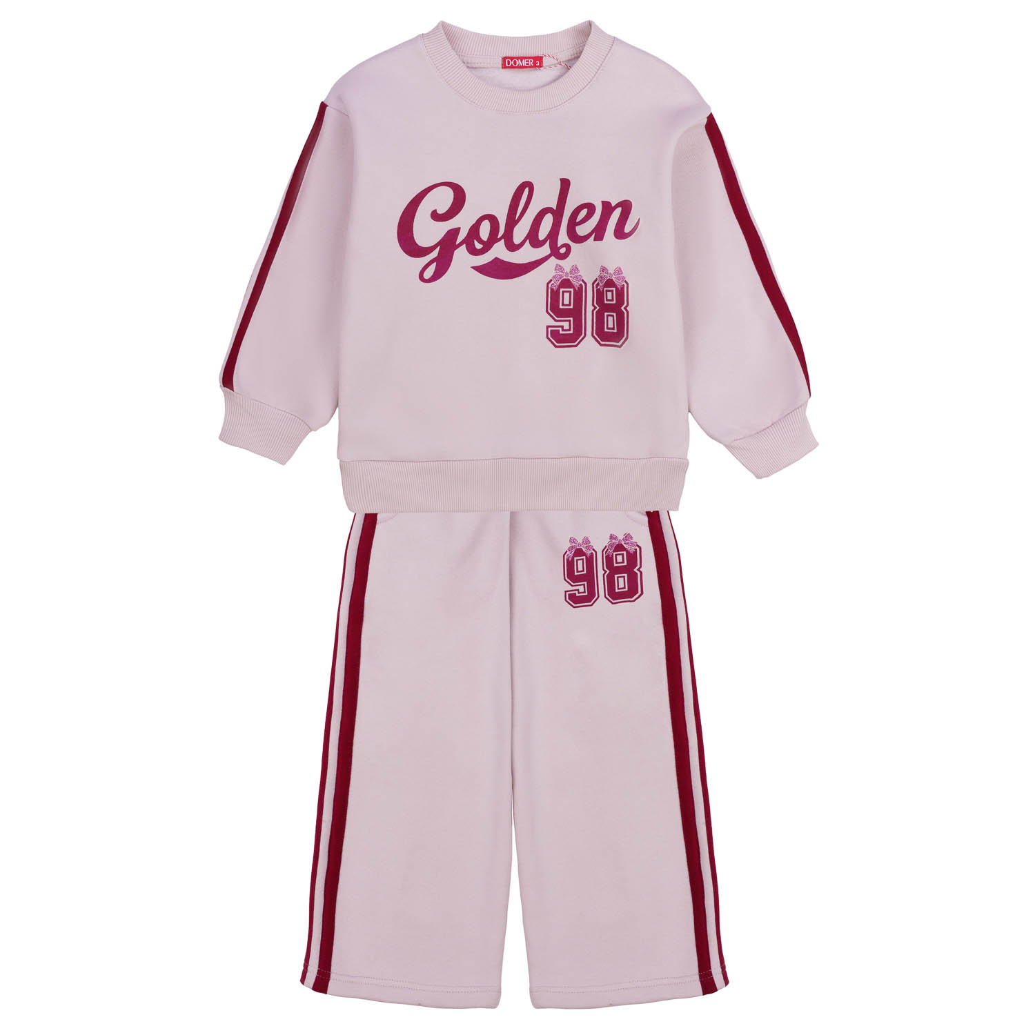 Καταληκτικό σετ φόρμα χοντρό με φλίς επένδυση , ιδανικό για κρύες μέρες, σε ρόζ απόχρωση με σχέδια γράμματα και ρίγα στο πλάι σε ματζέτα χρώμα , άνετο με παντελόνι καμπάνα.
