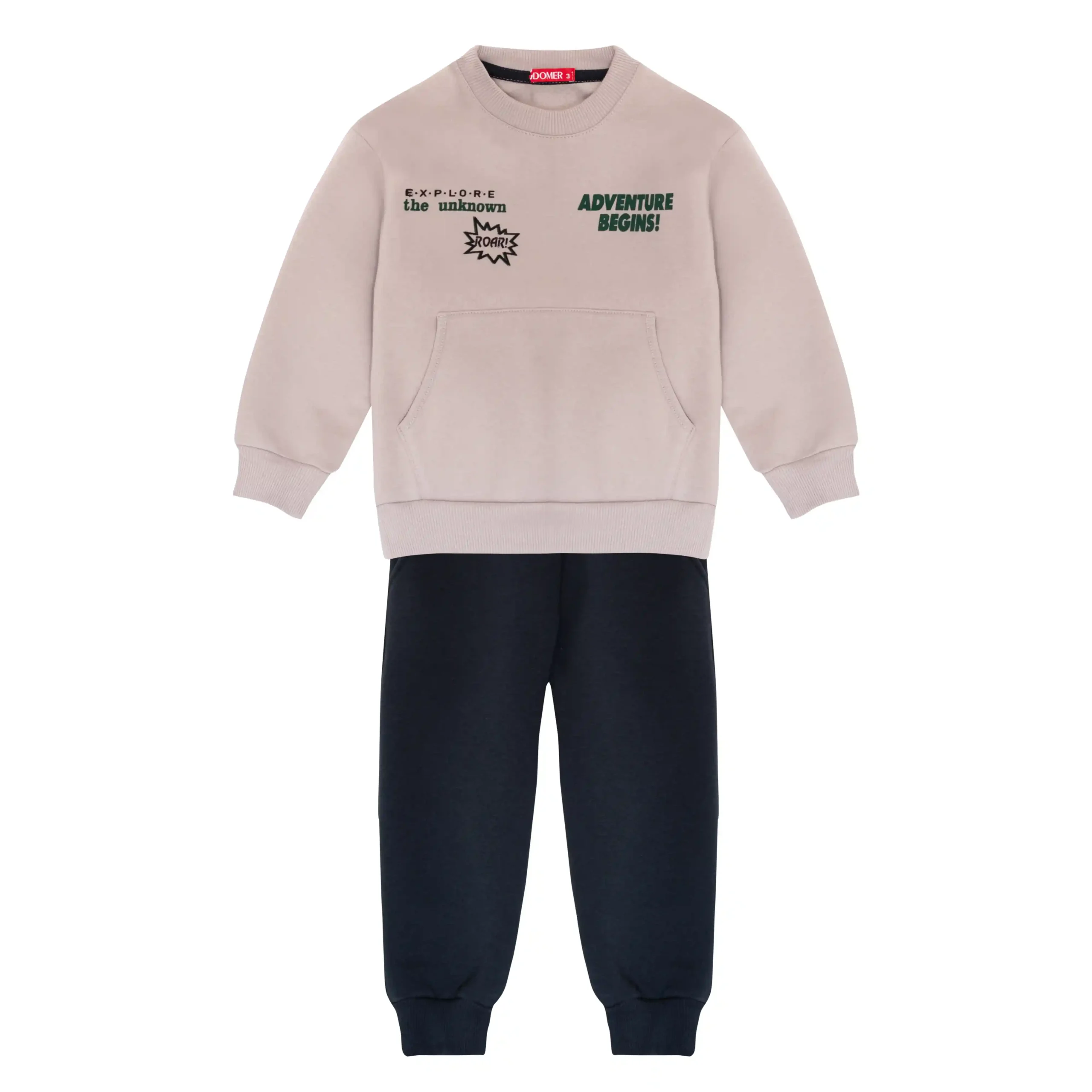 Domer σετ φόρμες για αγόρια με φλίς επένδυση στο εσωτερικό , με πράσινο παντελόνι και μπεζ μπλούζα με τσέπη και σχέδιο στη πλάτη.