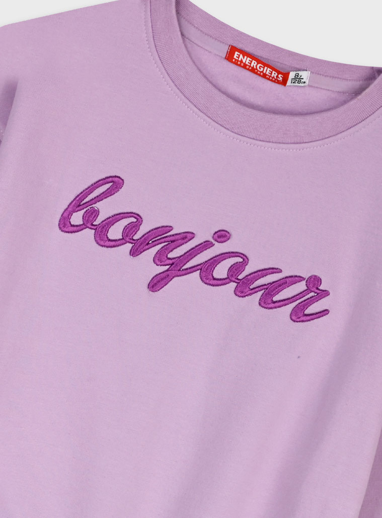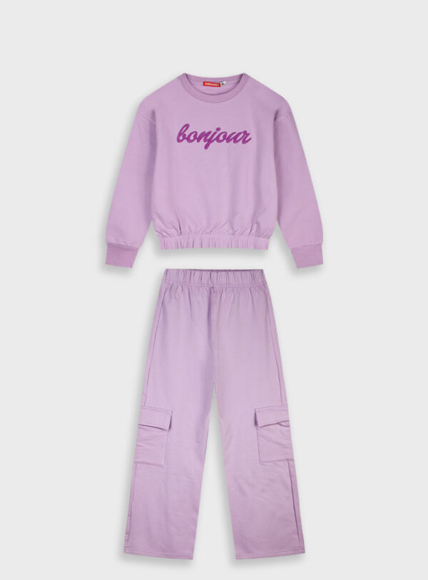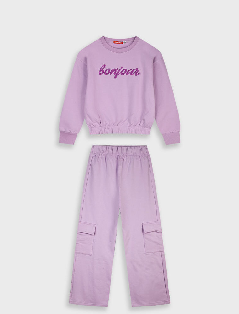 Σετ φόρμες λιλά για κορίτσι , μπλούζα με λάστιχο και τύπωμενα γράμματα και παντελόνι ίσια γραμμή με τσέπες.