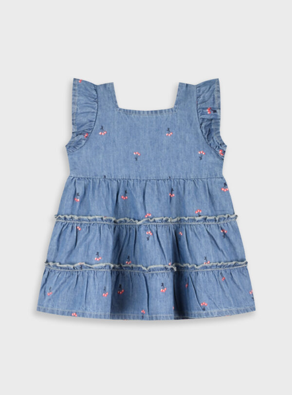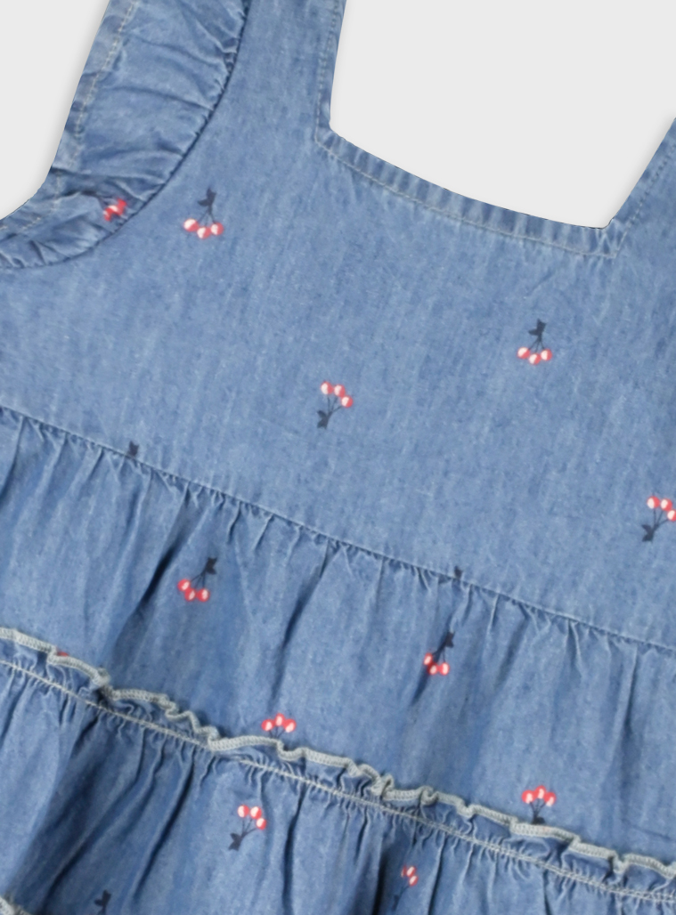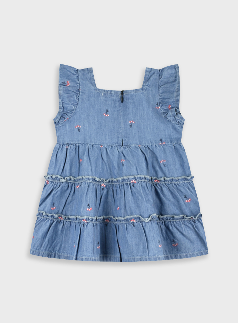 Φόρεμα τζίν χρώμα με κέντημα λουλουδάκια , μαλακό και αέρινο με φερμουαρ στο πίσω μέρος.